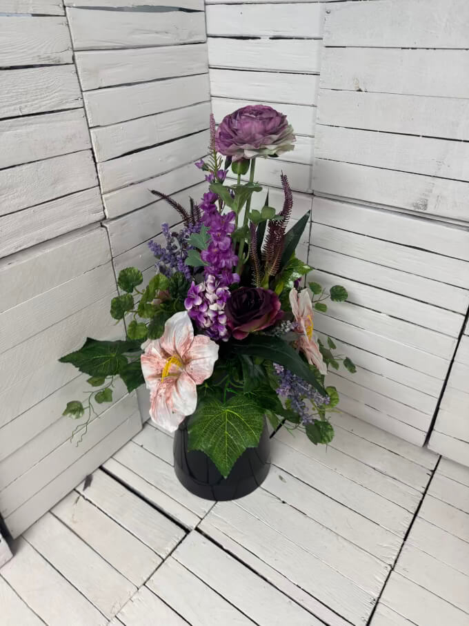 Połączenie stroika z bukietem sprawia, że nagrobek wygląda profesjonalnie, bez konieczności dodatkowych aranżacji.