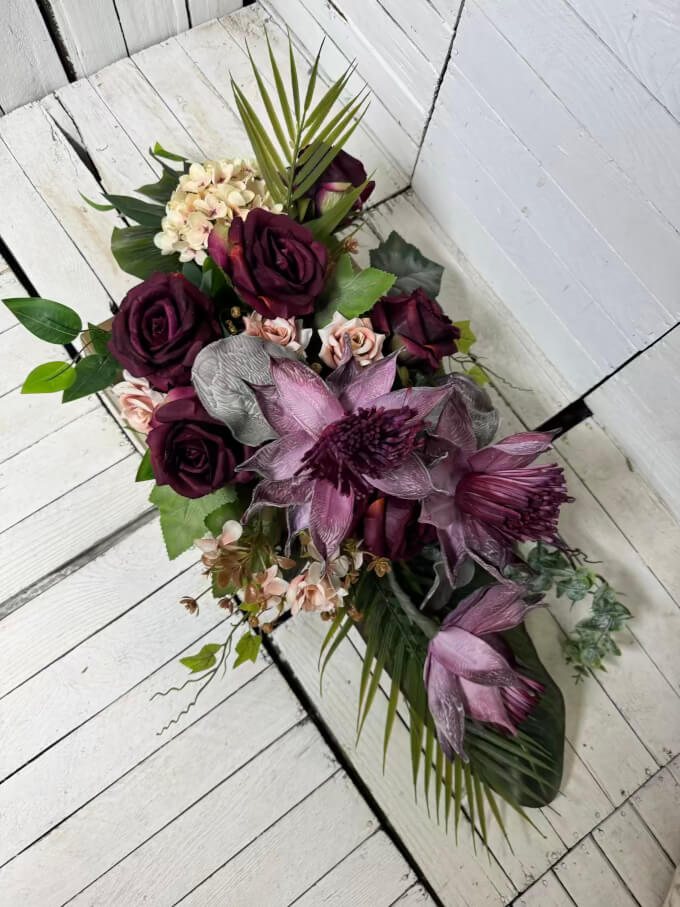 Nowoczesne stroiki na cmentarz ze sztucznych kwiatów, nietypowe stroiki na cmentarz, tanie stroiki na cmentarz