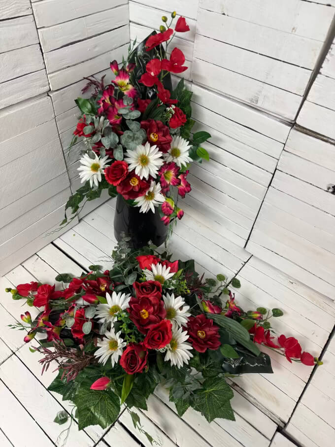 Nowoczesne stroiki na cmentarz ze sztucznych kwiatów, nietypowe stroiki na cmentarz, tanie stroiki na cmentarz