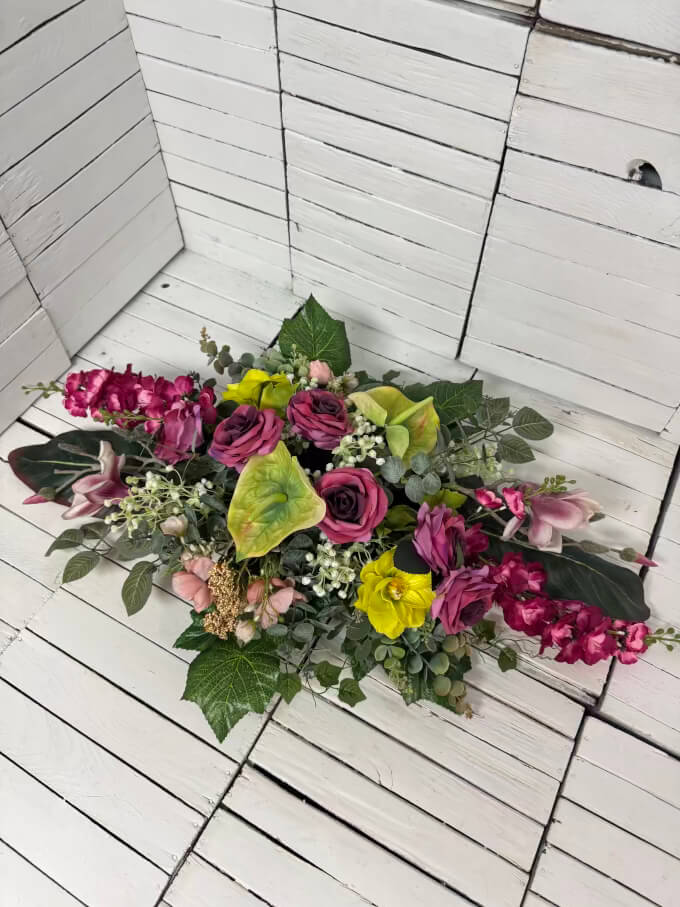 Zestaw składa się z efektownego bukietu poziomego na grób oraz dopasowanego stroika do wazonu, tworząc spójną i estetyczną dekorację miejsca spoczynku. To idealny wybór dla osób, które szukają trwałego, estetycznego i całorocznego rozwiązania na pomnik.