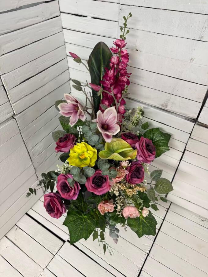 Nowoczesne stroiki na cmentarz ze sztucznych kwiatów, nietypowe stroiki na cmentarz, tanie stroiki na cmentarz