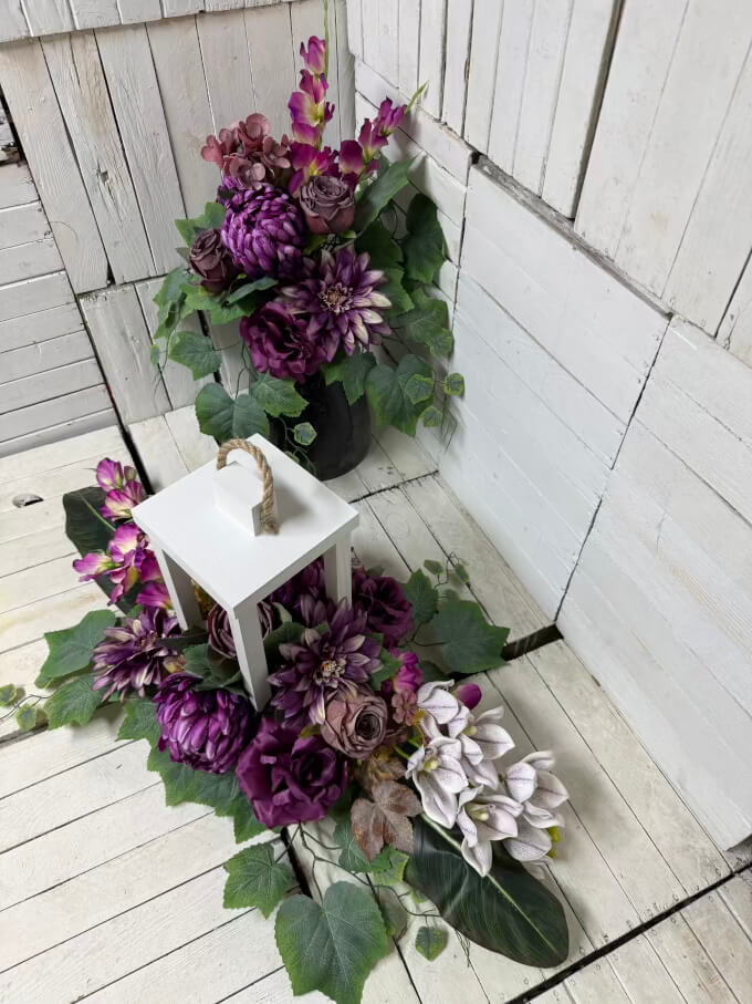 Elegancki komplet na cmentarz-stroiki- Bukiet i stroik KOMPET na cmentarz nagrobny kompozycja nowoczesny lampa Wszystkich Świętych wiązanka zdjęcia galeria Lh9997p