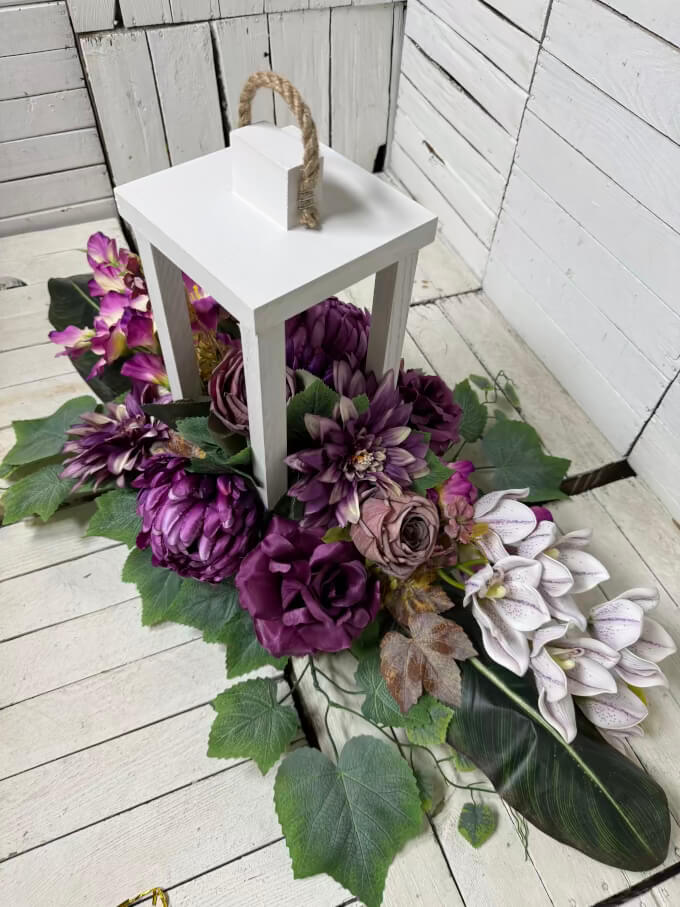 Nowoczesna kompozycja nagrobna lampą – stroik i bukiet na cmentarz