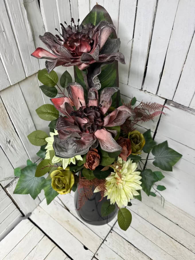 Nowoczesne stroiki na cmentarz ze sztucznych kwiatów, nietypowe stroiki na cmentarz, tanie stroiki na cmentarz