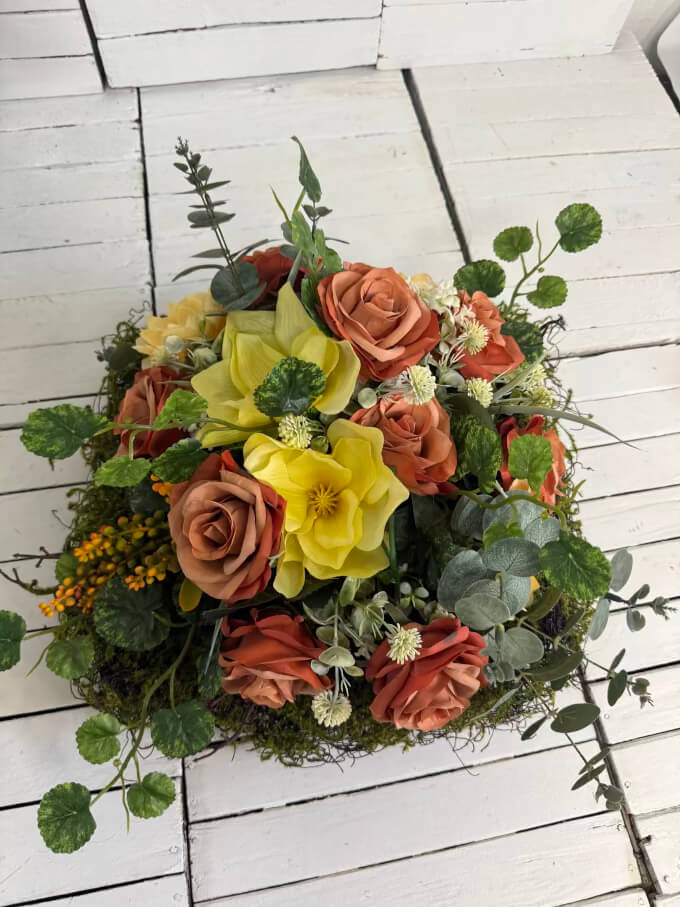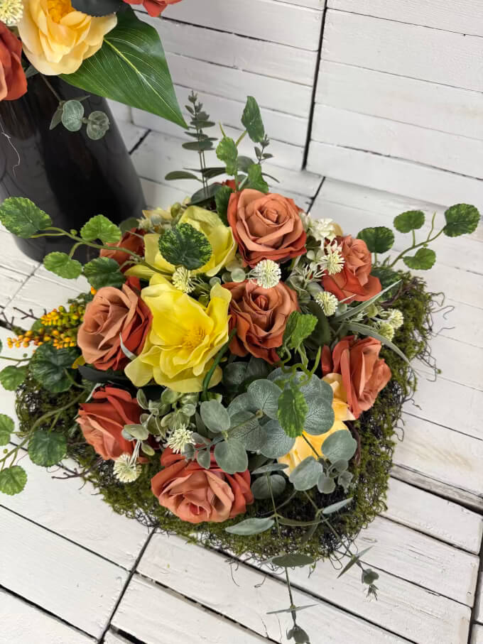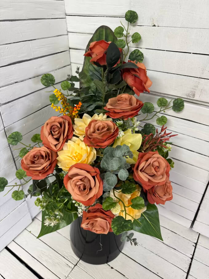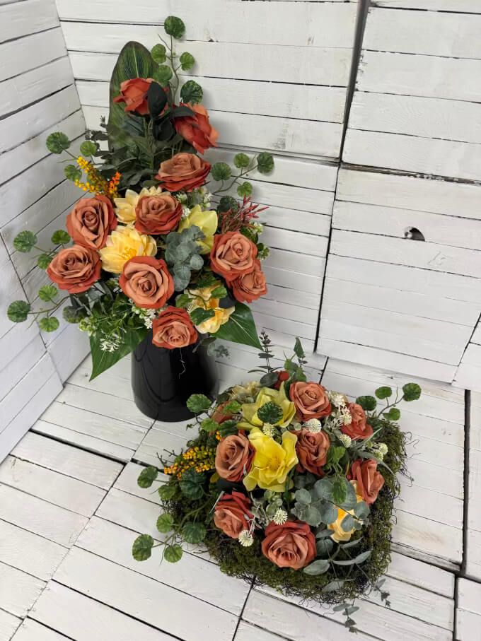 Wyjątkowy komplet nagrobny w odcieniach brązu, który zachwyca lekkością formy i naturalnym wyglądem kwiatów. To elegancka i harmonijna kompozycja stworzona z myślą o godnym upamiętnieniu bliskich.