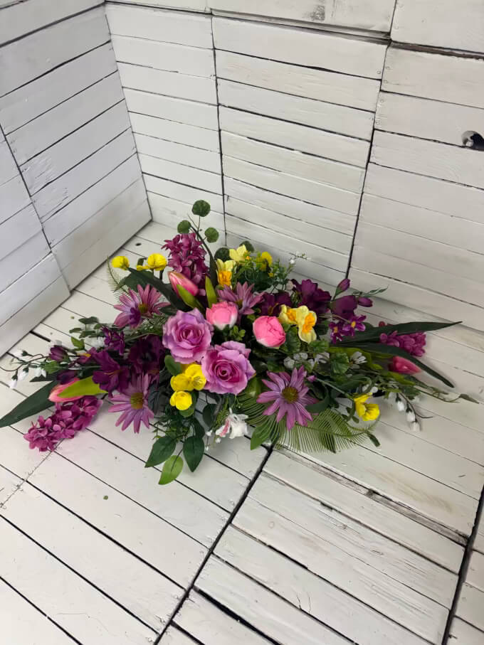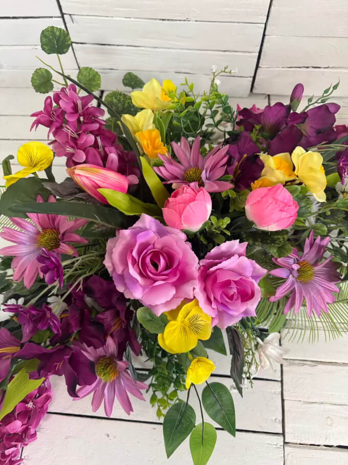 Nowość Elegancka kompozycja nagrobna ze sztucznych kwiatów. Trwały, ręcznie robiony stroik na grób 2026-18