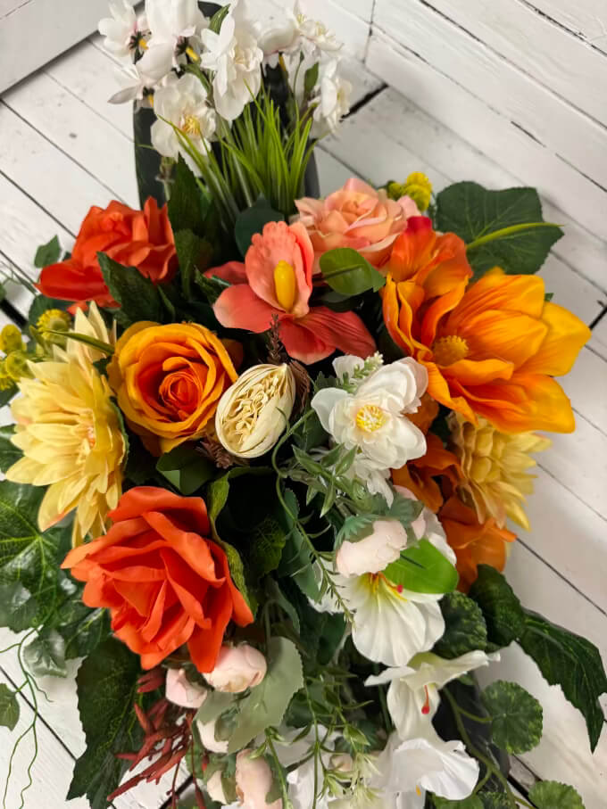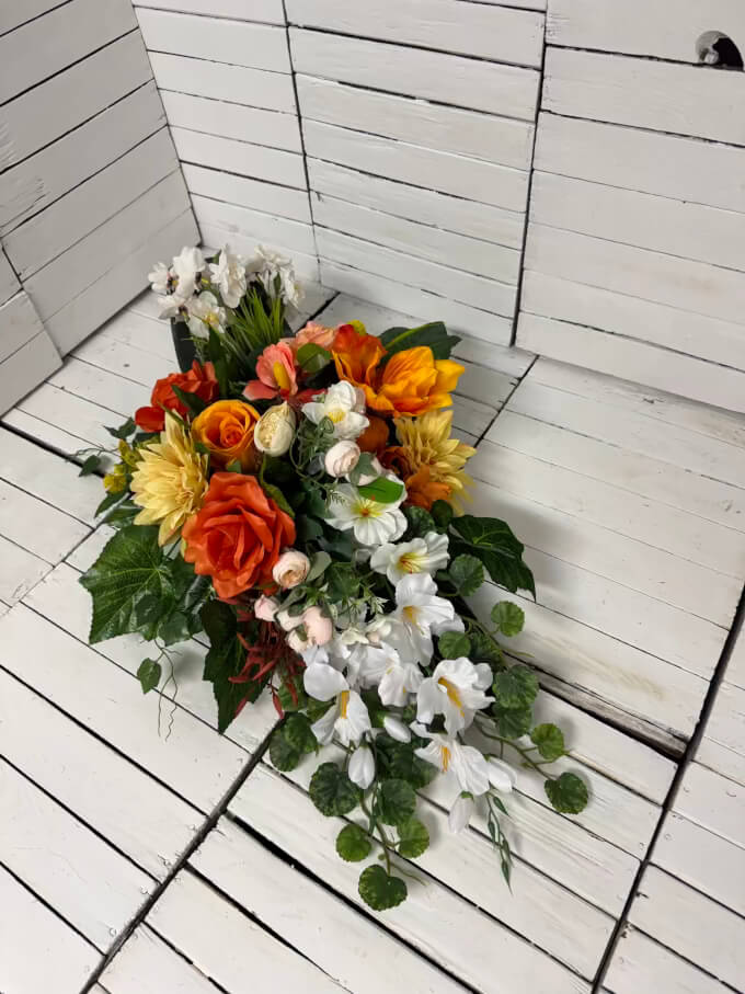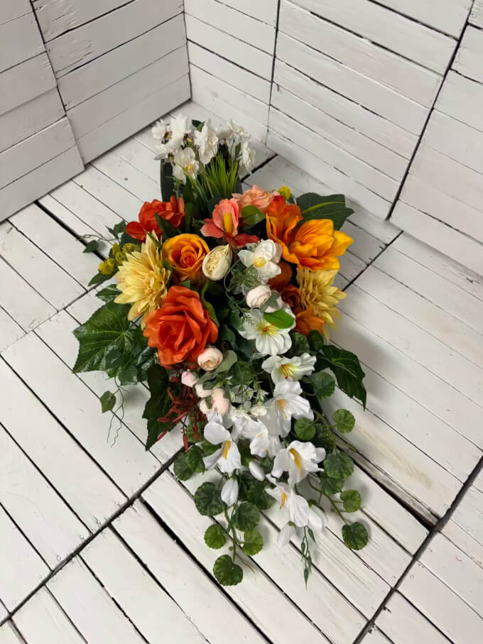 Wyrazisty stroik nagrobny w pomarańczowych odcieniach, symbolizujący energię, nadzieję i pamięć pełną życia. Starannie ułożony na trwałej podstawie, odporny na deszcz i wiatr, dodaje kolorów i ciepła na grobach bliskich.