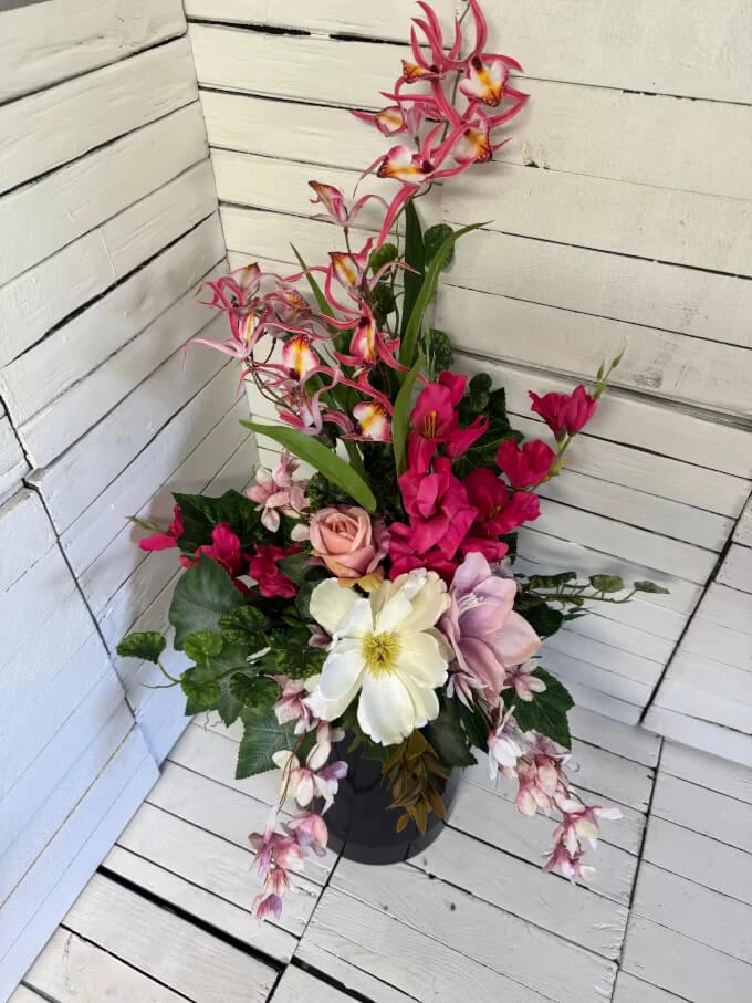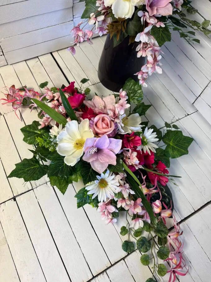 Szukasz wyjątkowej dekoracji nagrobnej, która będzie jednocześnie elegancka, trwała i pełna delikatności? Ten zestaw – stroik na cmentarz oraz pasujący bukiet do wazonu – to starannie wykonana kompozycja w subtelnej, różowej kolorystyce, idealna na grób mamy lub cioci.