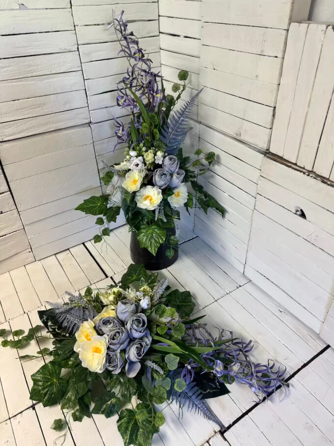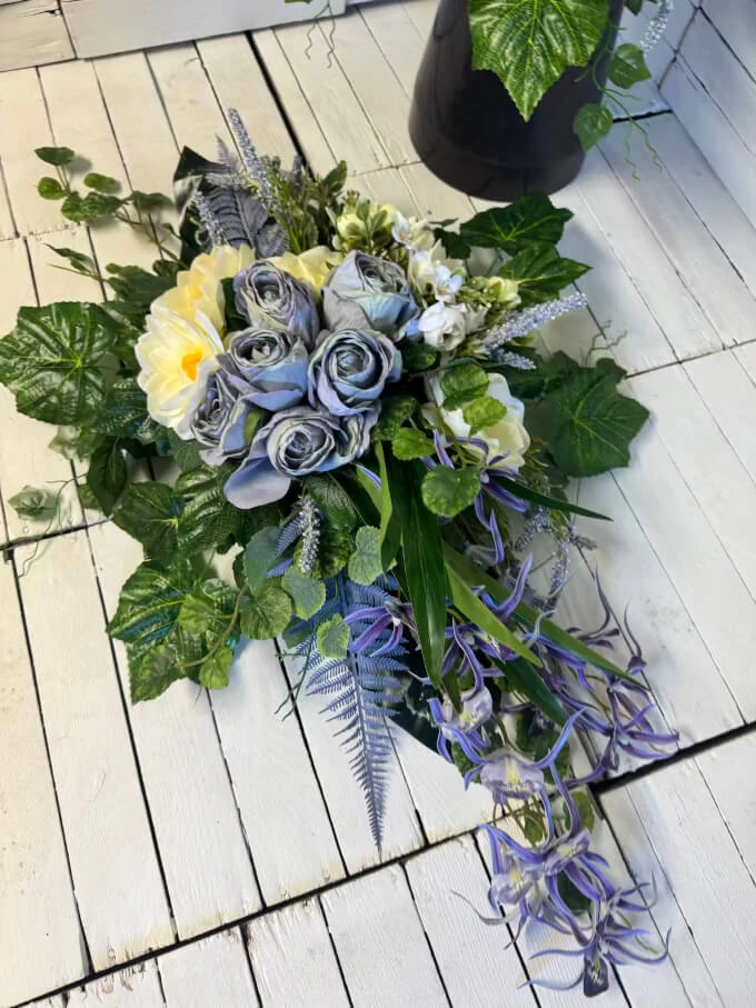 Szukasz wyjątkowej dekoracji nagrobnej, która łączy estetykę, trwałość i spójność kolorystyczną? Ten komplet – stroik oraz bukiet na cmentarz – został zaprojektowany z myślą o osobach, które cenią elegancki, nowoczesny wygląd oraz harmonię kompozycji.
