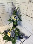Zestaw utrzymany jest w tej samej tonacji kolorystycznej, dzięki czemu tworzy piękną, dopasowaną całość. Dominującym elementem dekoracyjnym jest nietypowy storczyk w subtelnym, niebieskim odcieniu, który nadaje kompozycji wyjątkowego charakteru i przyciąga uwagę swoją oryginalnością.