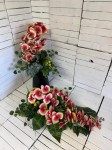 Zestaw składa się z efektownego bukietu poziomego na grób oraz dopasowanego stroika do wazonu. Obie części tworzą spójną, harmonijną kompozycję, idealną na pomnik. Nowością są arbuzowe storczyki, które nadają dekoracji wyjątkowego charakteru.